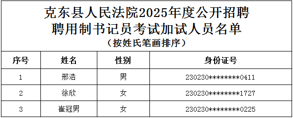 2025年9月10日,克东县人民法院2025年度公开招聘聘用制书记员面试工作结束。经梳理汇总,有3名考生笔试、面试综合成绩并列第二名。