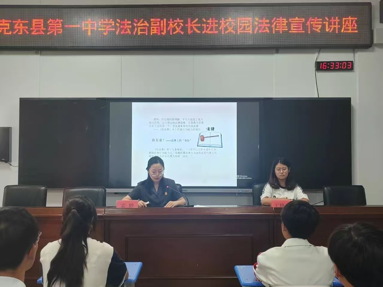 在第一中学,审判管理办公室(研究室)主任孟晗围绕未成年人日常生活中可能面临的法律风险,重点讲解了“网络游戏充值”“网络刷单诈骗”“未成年人直播打赏”等常见涉法问题。并通过现场互动形式与同学们积极交流,在轻松热烈的氛围中加深了学生对法律知识的理解和运用能力。