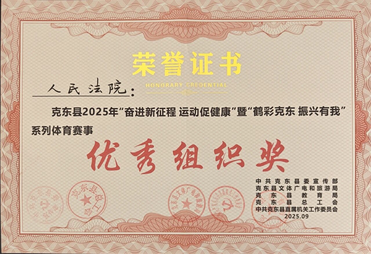 近日,克东法院在全县2025年“奋进新征程 运动促健康”暨“鹤彩克东 振兴有我”全民健身系列体育赛事中荣获“优秀组织奖”。