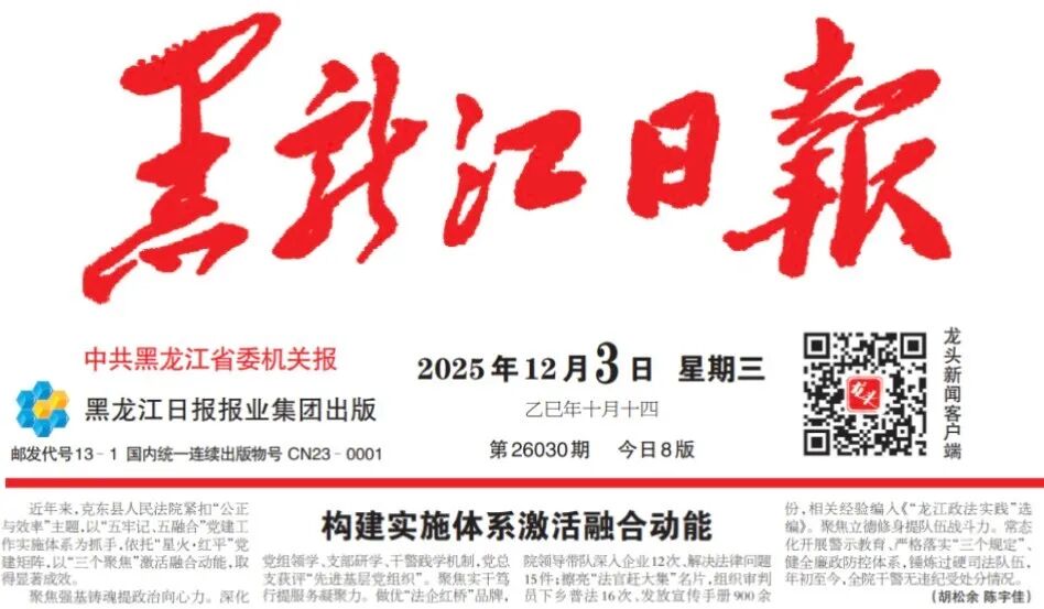 近年来,克东法院紧扣“公正与效率”主题,以“五牢记五融合”党建工作实施体系为抓手,依托“星火·红平”党建矩阵,围绕“三个聚焦”靶向攻关,切实提升队伍向心力、服务聚合力、队伍战斗力,奋力推动党建与业务同频共振、深度融合,为审判工作现代化凝聚磅礴力量。12月3日,《黑龙江日报》在第8版刊发《构建实施体系激活融合动能》,报道克东法院在推动党建与业务融合发展中的积极做法和创新成效。