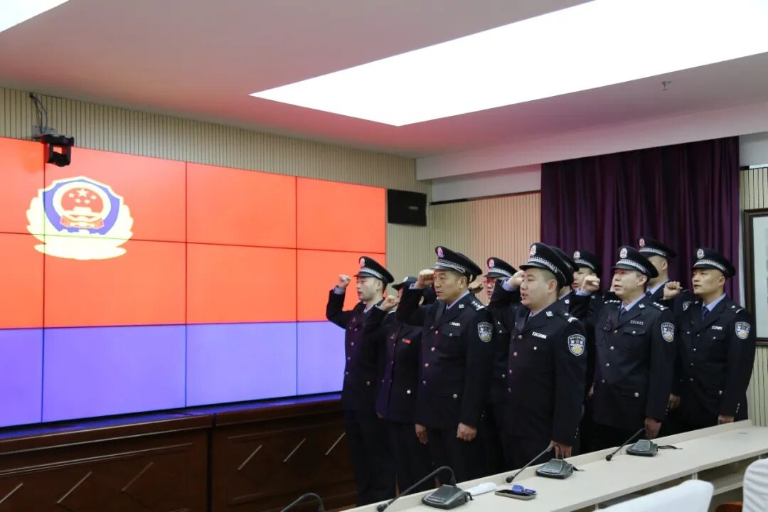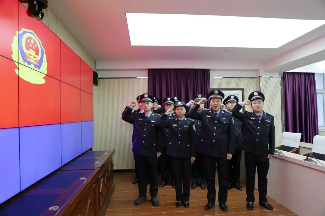 “我是中国人民警察,我宣誓:坚决拥护中国共产党的绝对领导,矢志献身崇高的人民司法事业……”在武新峰主任的领誓下,干警们警容严整、精神抖擞,面向警旗庄严宣誓,铿锵有力的誓言充分表达了对党和人民的无限忠诚和捍卫法律尊严、守护公平正义的坚定信念。