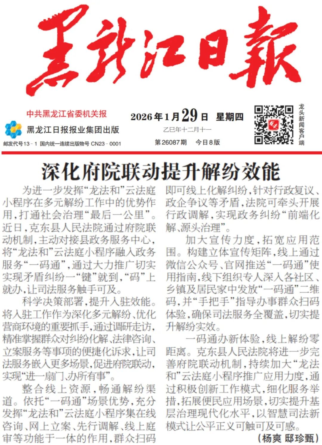 为进一步发挥“龙法和”云法庭小程序在多元解纷工作中的优势作用,打通社会治理“最后一公里”。近日,克东法院通过府院联动机制,主动对接县政务服务中心,将“龙法和”云法庭小程序融入政务服务“一码通”,通过大力推广切实实现矛盾纠纷一“键”就到,“码”上就办,让司法服务触手可及。1月29日,《黑龙江日报》在第6版刊发文章《深化府院联动提升解纷效能》,报道克东法院持续加强“龙法和”云法庭小程序宣传推广工作,大力推动矛盾纠纷多元化解的积极做法。