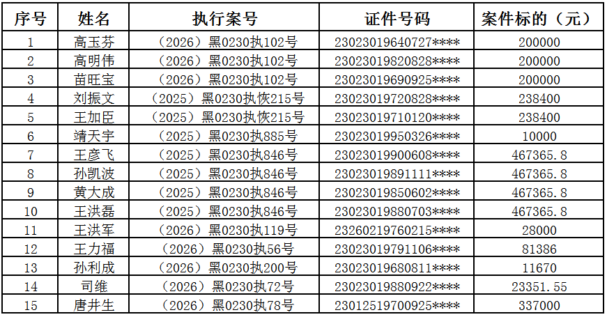 失信曝光台|克东法院公布失信被执行人名单