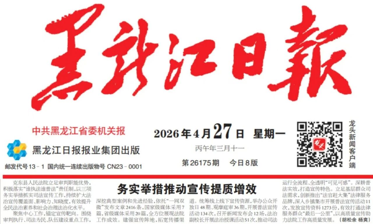 克东法院深入贯彻习近平法治思想,立足审判职能优势,积极落实“谁执法谁普法”责任制,以三项务实举措抓实司法宣传工作,持续扩大法治宣传覆盖面、影响力、知晓度,有效提升全民法治素养和社会治理法治化水平。4月27日,《黑龙江日报》在第7版刊发《务实举措推动宣传提质增效》,报道克东法院围绕中心工作大局,以高质量宣传工作树立司法权威的新作为、新气象。
